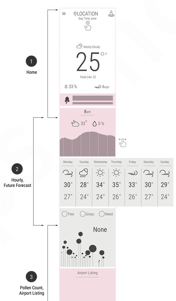 Feedback from our users indicated they had trouble switching locations once they added them. The original design using arrows had low user engagement. A card based gesture approach helped solve the issue.